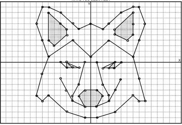 To make him bigger or smaller, we need to adjust all the dots by some scale. If we make the center of the graph 0, 0, the tip of his ear on the right is at 8x, 10y (8 ticks right from center on the X axis, 10 ticks up from center on the Y axis) and the bottom left of his face is -9x, -6y (9 ticks left of center on the X axis, 6 ticks down from center on the Y axis).