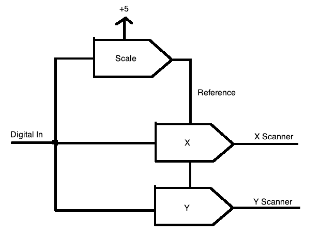 To scale up to double size, we could multiply by 2.0. To invert the image on both axes we could multiply by -1.0. As I said, simple but, again, CPU power used to be very limited. So let’s see how we might solve scaling with 3 multiplying DACs: