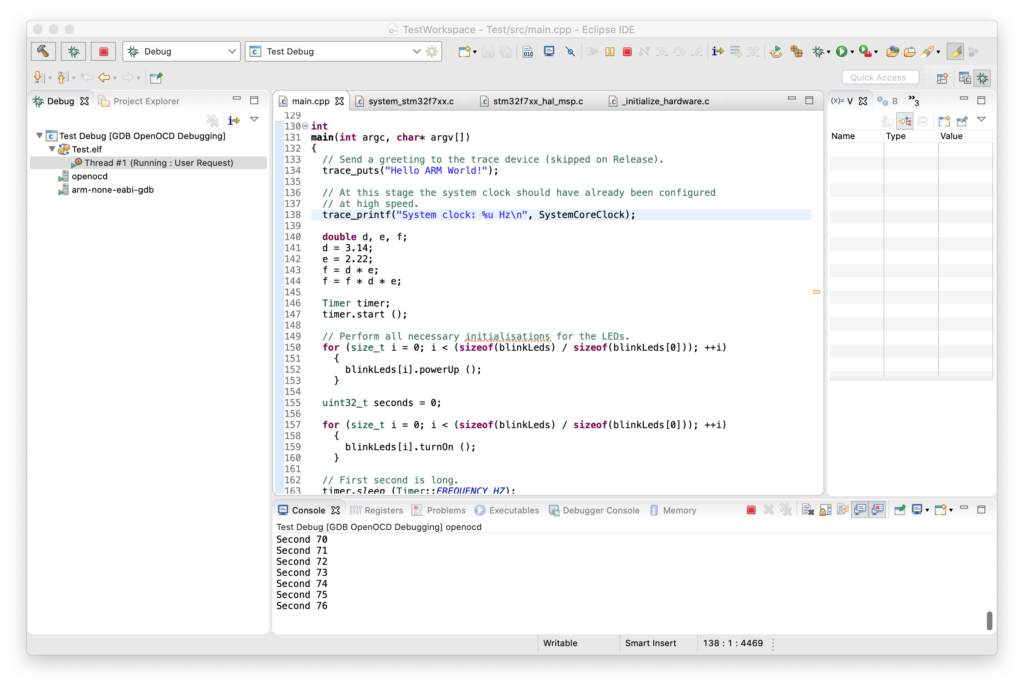 Debugging from a terminal window is doable, but a massive pain, so let’s cobble together an IDE environment for the GCC toolchain using Eclipse. It’s not a great IDE, but its free. In addition to the toolchain above and our IDE, we’ll need a way to connect the GCC debugger to our ST-Link debugging probe built in to the eval board. For that we can use OpenOCD.
