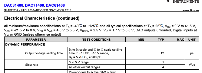 But I had two concerns about moving to the DAC81408. First, it is about $15 more expensive in small quantities than the DAC80508. Not the end of the world, but something to keep in mind. Second, the spec’ed settle time is 2.5x longer (12 uS vs 5 uS):