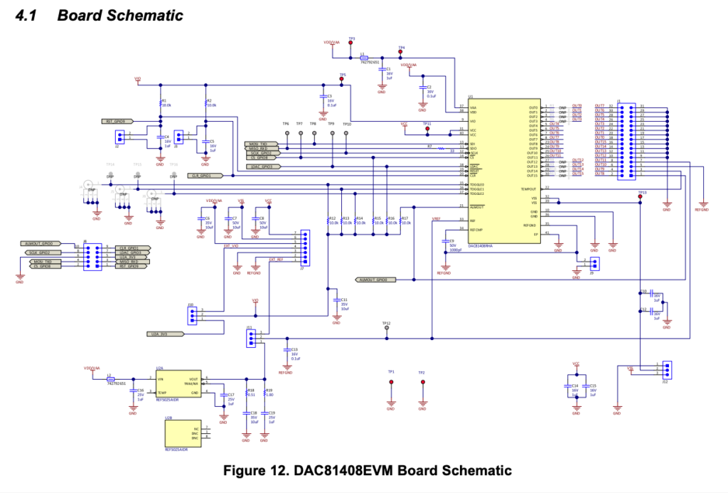 In this mode we have to write to each of the 8 DACs individually and control NSS (connected to the /CS pin on the DAC chip) via software each time. That’s a lot of firmware overhead managing an I/O line just so we can update our DAC values. There are some ways we could work around this with some hardware tweaking, but all the ones that I could think of involved modifying the MCU board to use other peripherals and pins, so I started thinking about DAC alternatives. As it happens, I’ve been working with another TI DAC on a work project, a DAC81408. I even happen to have the TI EVM (Evaluation Module) for it!
