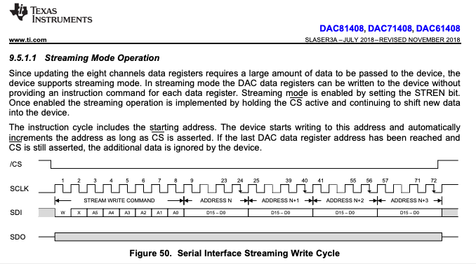 I already had used this DAC for a work project, so getting the SPI communication working with our EVAL board went pretty quickly. I ended up using the DAC in “Streaming Mode”: