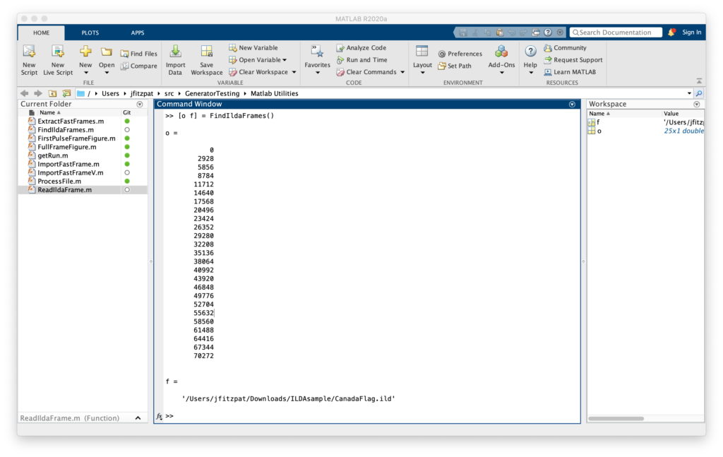 In this case ([o f] = FindIldaFrames()), we got two variables o, with the 25 offsets to frames in the file selected, and f, the full path to the CanadaFlag.ild file parsed (courtesy of function [offsets fpath] = FindIldaFrames (inputfile)). The second script gets the important data: