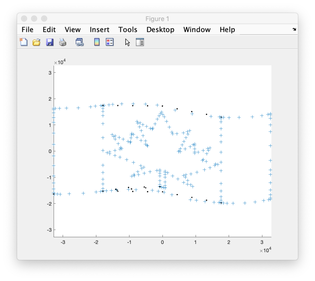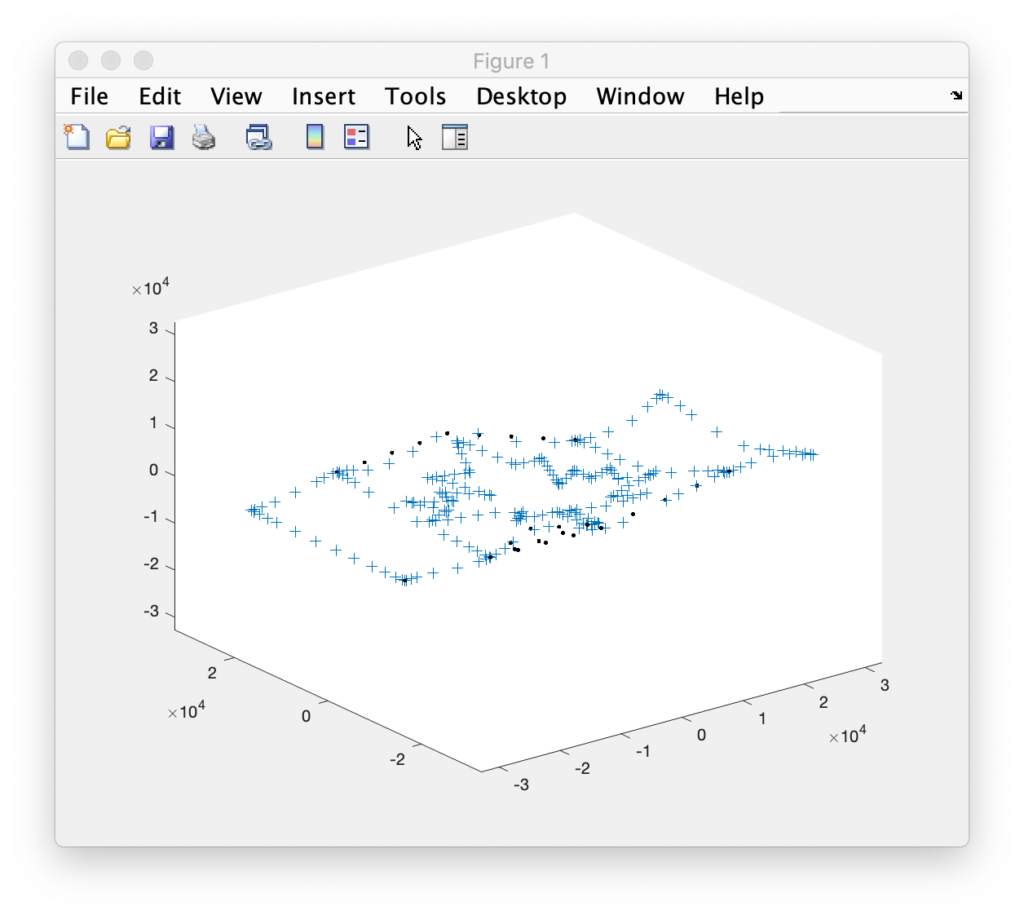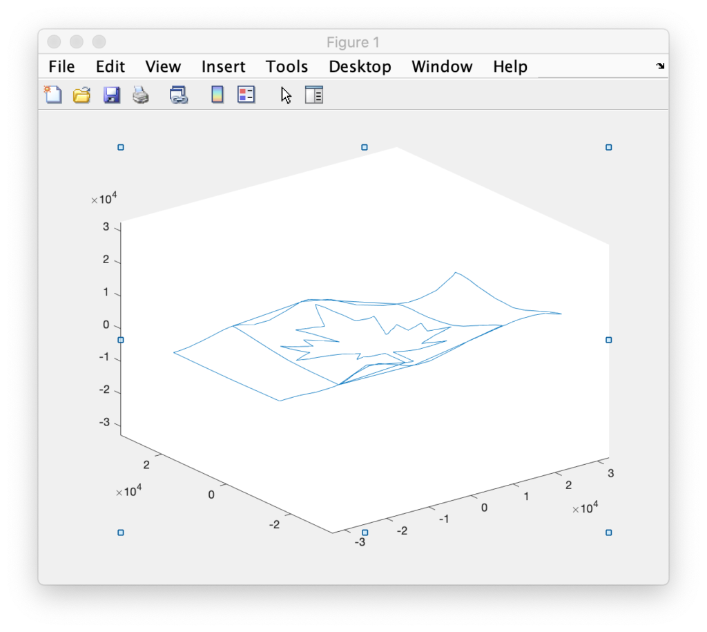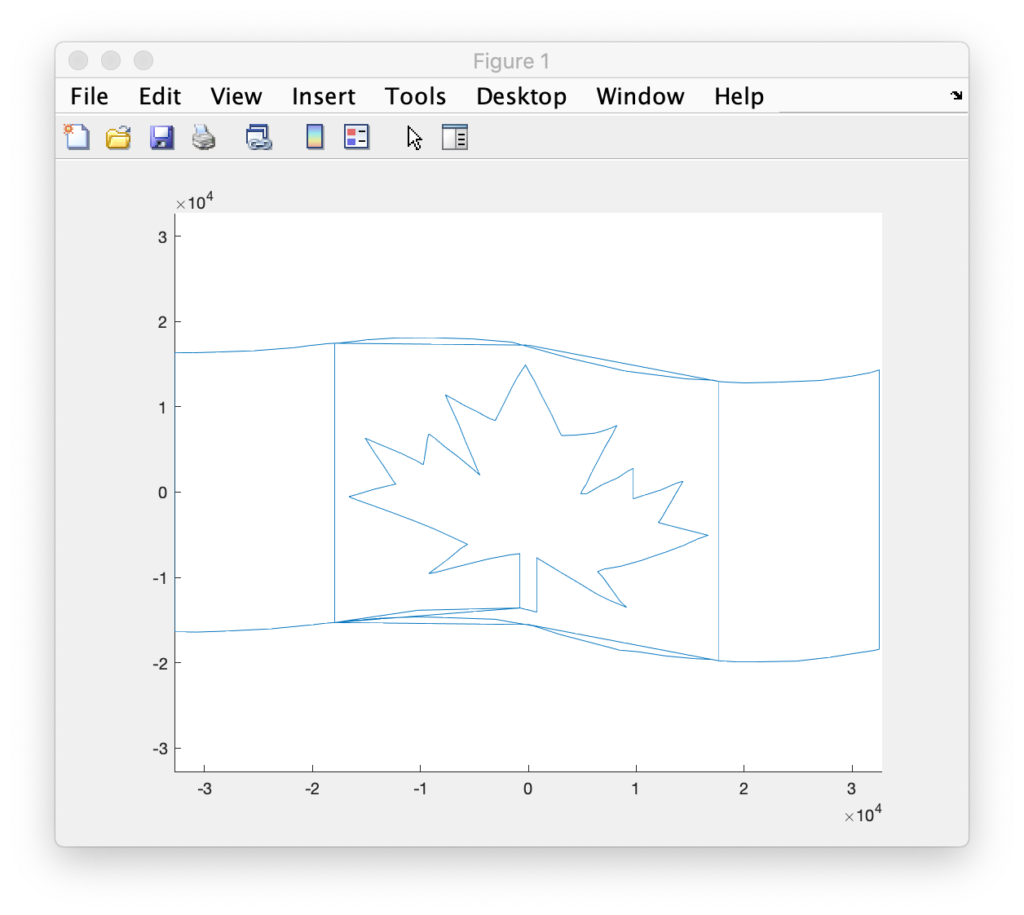 In this case ([x y z s c] = ReadIldaFrame(f, o(1))), got us all the data for the first frame of the file we parsed in the previous operation into some new variables. Entering plot3(x,y,z) will then show us, yep, it’s a Canadian flag drawn in 3D, we can rotate around: