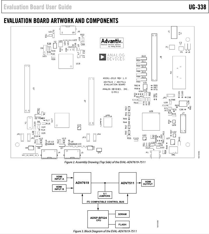 An ADV7619 decodes the HDMI into sync, clock, and pixel lines. An ADV7511 re-encodes those lines to HDMI. And an onboard MCU manages both, letting you peek at and change all the registers. All the lines are also brought out to handy headers for easy monitoring and experimentation.