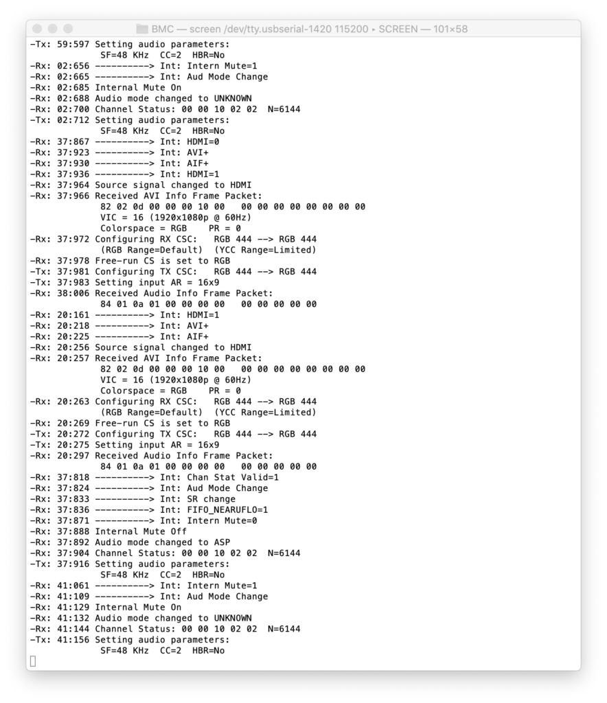 One caveat is HDCP, the copy protection scheme supported by HDMI. The HDMI output on my Macbook uses HDCP. We aren’t a licensed HDMI adopter, so we have no HDCP keys to report from our board. If you use this setup between my Mac and a monitor, the monitor will work for a few seconds, then the system will black out and the HDCP error will be reported to the terminal.