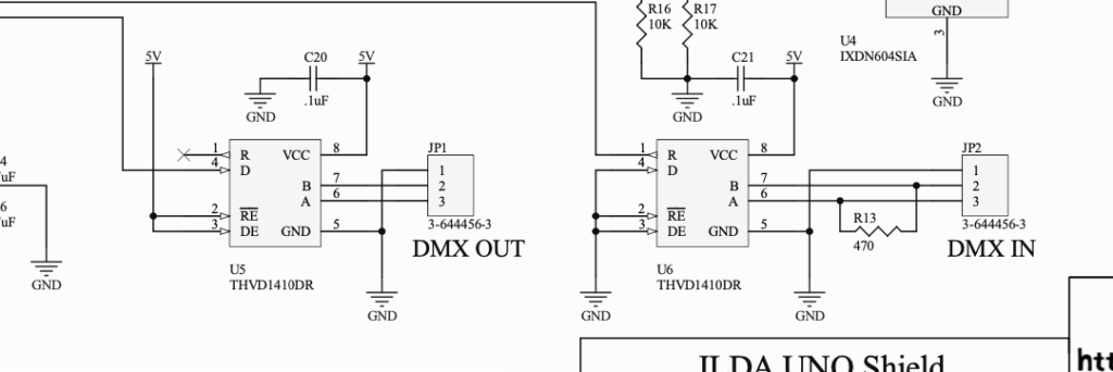Along the bottom of the schematic is our DMX circuitry. We have a UART controller on the main board, so we only have to provide RS-485 transceivers. These can operate half duplex, but we have one fixed for receiving, the other for transmitting. We also have a termination resistor on our input.