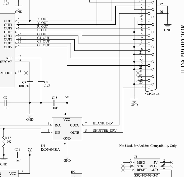 Well, we finally have a schematic for our Arduino UNO compatible ILDA “shield” (PDF version here). It’s pretty close to what we sketched out here. And prototyped here.