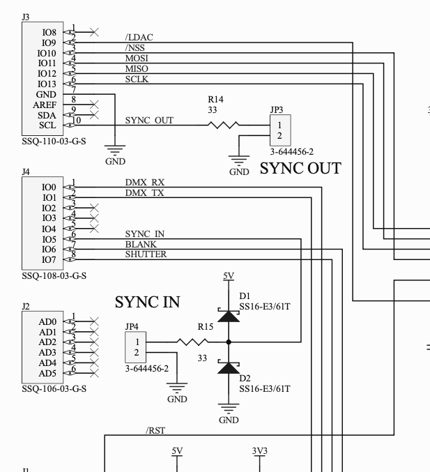 As planned, Sync In and Out are pretty simple general purpose IO from the MCU. Both just have a pad resistor for ringing and a little bit of current protection and the Sync In has some beefy protection diodes added. These do add some capacitance to our input, but it should be fine for the frequencies we are interested in for now, and the extra protection diodes give some piece of mind.