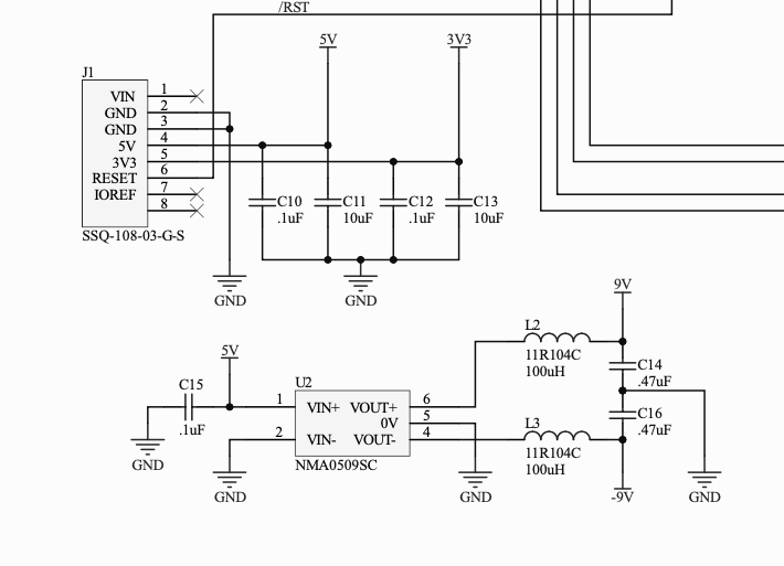 Only 5V and 3.3V come to our board from the host card. In the lower left corner you can see we have some filter caps to clean up the voltages provided and a DC-DC switching converter to provide +/- 9V from 5V in.