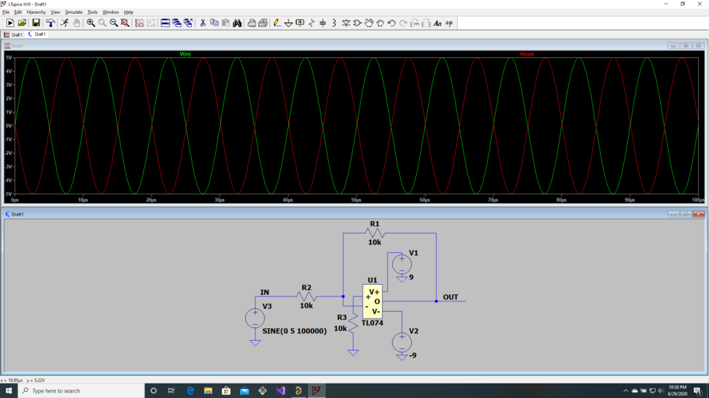 If you haven’t worked with op amps, you can download a SPICE model for this one here. LTSpice is a free version of SPICE for Windows that many electrical engineers use. Although it isn’t perfect, simulation is a great way to try things out without prototyping them. In this case, I know that the inverting amplifier will put out an inverted form of the +/-5V signal I put in, but we can still quickly check performance at higher frequencies: