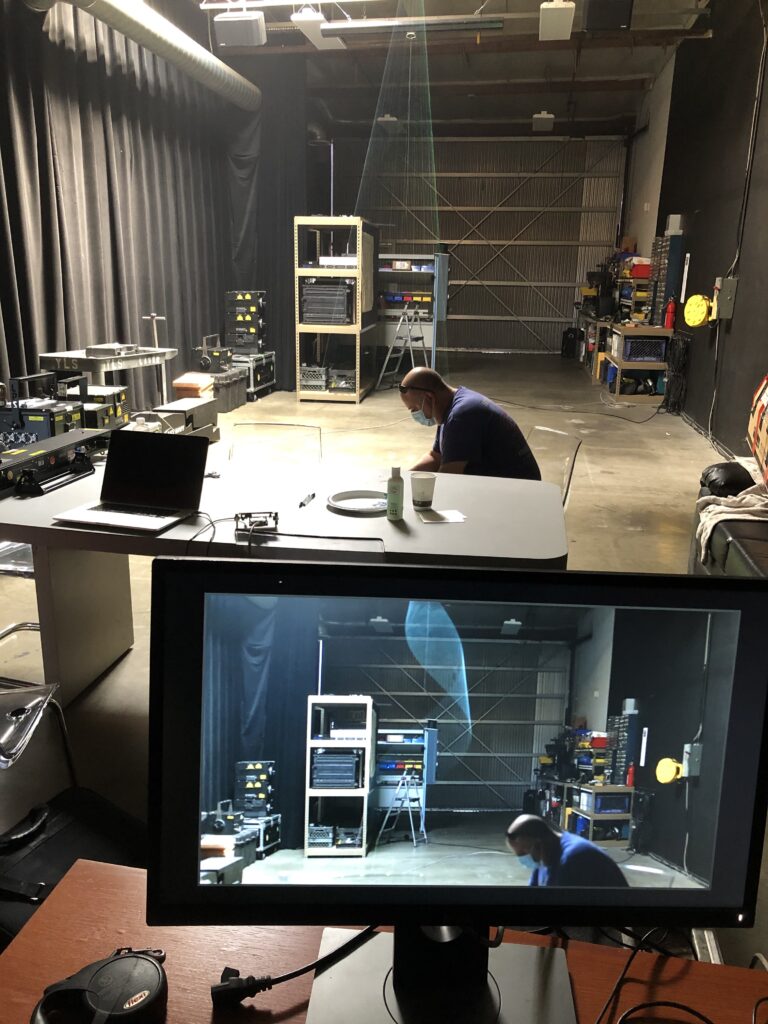 Next they showed me the interaction of the commercial scanning system they are using now with a rolling shudder. You could get the gist, there were some cool results on the monitor, but you couldn’t really dial in the effects or smoothly manipulate them. So we switched to my card and started with a simple circle. We had no problem freezing or smoothly reversing the first physics defying spiral on the monitor we tried: